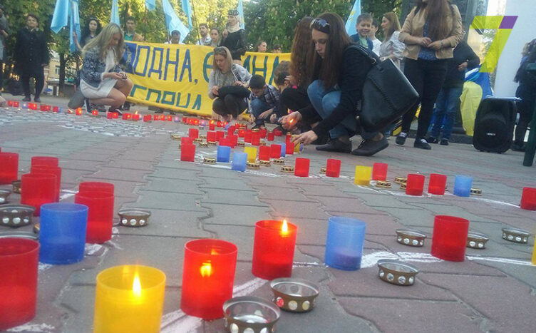 На траурную акцию пришли представители крымской диаспоры и одесситы. На асфальте выложили и зажгли лампадки в форме флага полуострова. В небо выпустили голубей.