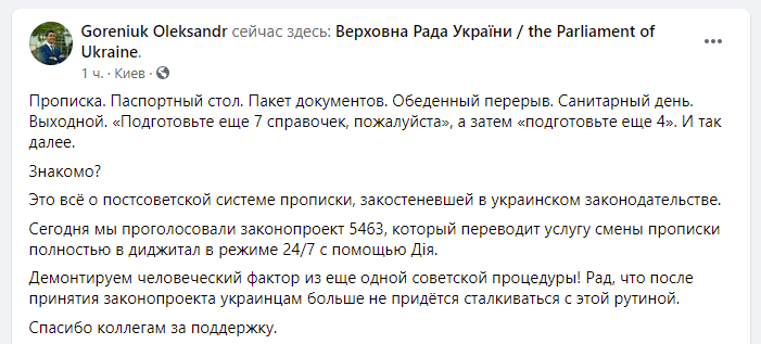 На сегодняшнем заседании Верховная Рада приняла за основу проект Закона № 5463 «О реализации публичных электронных услуг по регистрации и декларированию места жительства в Украине».