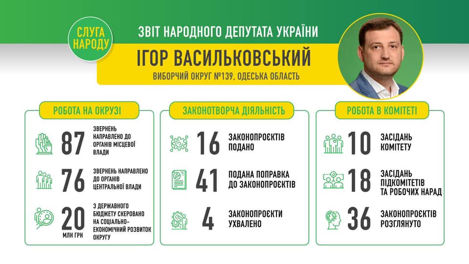 Наиболее существенным вкладом депутат считает защиту интересов своего округа. Благодаря его содействию, было выделено 8,4 млн грн на реконструкцию водопровода до села Дачное, а в Раздельнянской ОТГ выходит на финишную стадию  строительство новой школы. В целом Васильковский добился выделения более 20 миллионов гривен госсредств на социально-экономическое развитие региона.