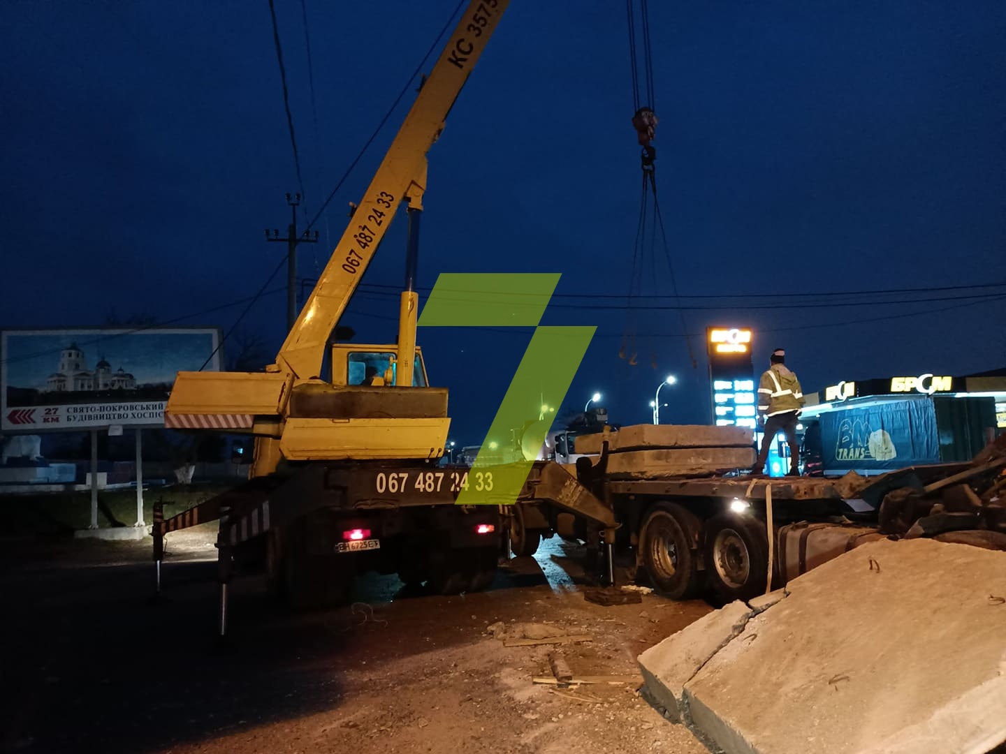 На месте аварии образовалась пробка во все стороны, сейчас здесь работает автокран — убирает упавшие плиты.