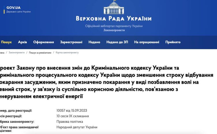 Відповідний законопроект зʼявився на сайті ВР. Його мета – змотивувати 50 тисяч ув'язнених генерувати електроенергію через велогенараційні установки. Таким чином, за місяць вони можуть скоротити свій термін на 3 дні. Але робити це можна не більше 10 місяців на рік. Тобто за один рік «велосипедисти» матимуть можливість зменшити увʼязнення максимум на 30 днів.